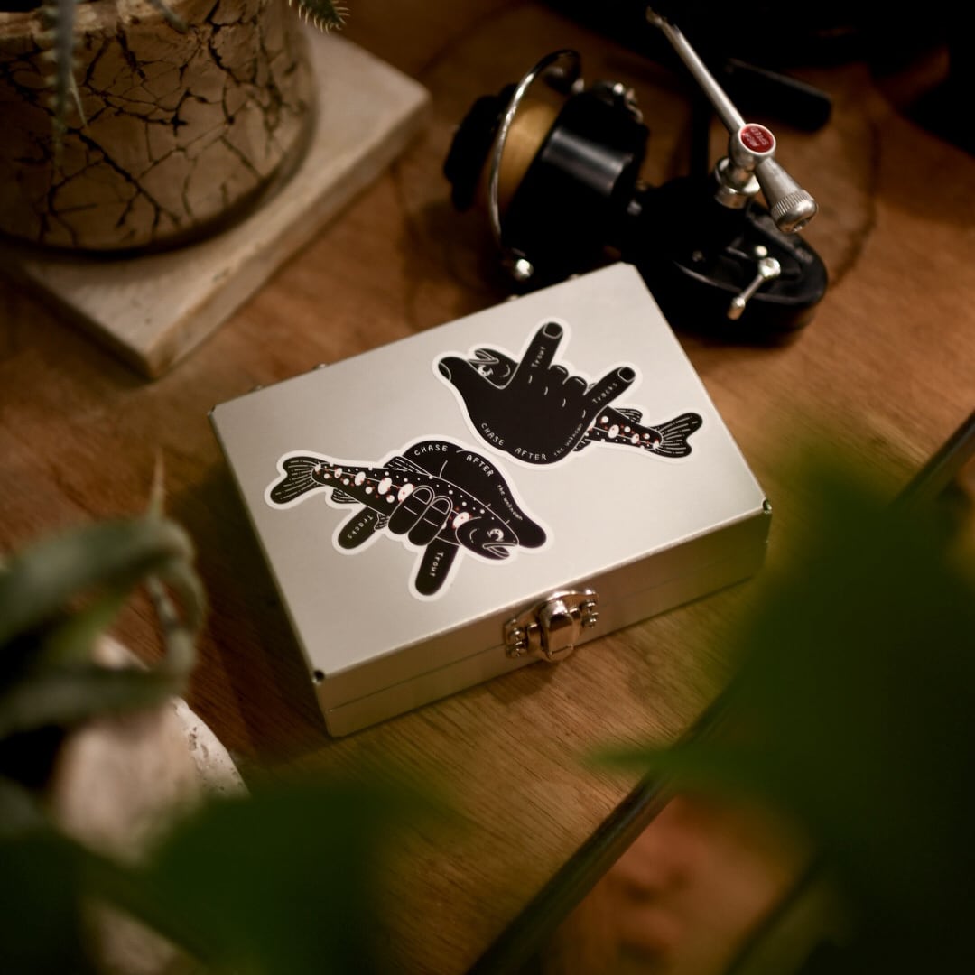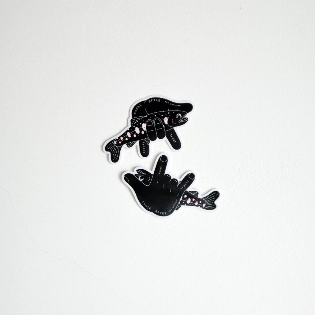 Trout Tracks : AMAGO マスの足跡:アマゴ 渓魚を追い駆ける人達のブツ持ちのクセ。 後ろから見ればI Love Youのハンドジェスチャー。 みんな渓魚が大好きだ。 種類:ステッカー(グロスPP加工・耐水・耐光) サイズ:H70mm × W44mm 枚数:2枚